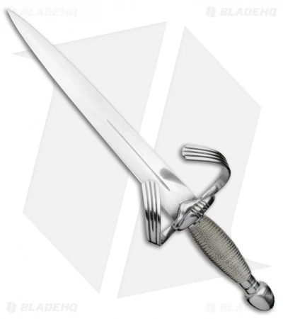 The Cold Steel Large Parrying Dagger has a 13-inch double-edged blade with and up- and out-swept cross guard for catching blades. Includes a leather sheath-wrapped wooden handle.